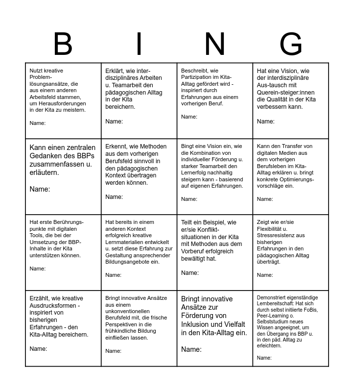 This bingo card has 16 words: Bringt innovative Ansätze aus einem unkonventionellen Berufsfeld mit, die frische Perspektiven in die frühkindliche Bildung einfließen lassen. Name:, Zeigt wie er/sie Flexibilität u. Stressresistenz aus bisherigen Erfahrungen in den pädagogischen Alltag überträgt. Name:, Beschreibt, wie Partizipation im Kita-Alltag gefördert wird - inspiriert durch Erfahrungen aus einem vorherigen Beruf. Name:, Nutzt kreative Problem-lösungsansätze, die aus einem anderen Arbeitsfeld stammen, um Herausforderungen in der Kita zu meistern. Name:, Hat erste Berührungs-punkte mit digitalen Tools, die bei der Umsetzung der BBP-Inhalte in der Kita unterstützen können. Name:, Erklärt, wie inter-disziplinäres Arbeiten u. Teamarbeit den pädagogischen Alltag in der Kita bereichern. Name:, Teilt ein Beispiel, wie er/sie Konflikt-situationen in der Kita mit Methoden aus dem Vorberuf erfolgreich bewältigt hat. Name:, Bringt innovative Ansätze zur Förderung von Inklusion und Vielfalt in den Kita-Alltag ein. Name:, Kann einen zentralen Gedanken des BBPs zusammenfassen u. erläutern. Name:, Erkennt, wie Methoden aus dem vorherigen Berufsfeld sinnvoll in den pädagogischen Kontext übertragen werden können. Name:, Erzählt, wie kreative Ausdrucksformen - inspiriert von bisherigen Erfahrungen - den Kita-Alltag bereichern. Name:, Hat eine Vision, wie der interdisziplinäre Aus-tausch mit Querein-steiger:innen die Qualität in der Kita verbessern kann. Name:, Hat bereits in einem anderen Kontext erfolgreich kreative Lernmaterialien entwickelt u. setzt diese Erfahrung zur Gestaltung ansprechender Bildungsangebote ein. Name:, Kann den Transfer von digitalen Medien aus dem vorherigen Berufsleben im Kita-Alltag erklären u. bringt konkrete Optimierungs-vorschläge ein. Name:, Bingt eine Vision ein, wie die Kombination von individueller Förderung u. starker Teamarbeit den Lernerfolg nachhaltig steigern kann - basierend auf eigenen Erfahrungen. Name: and Demonstriert eigenständige Lernbereitschaft: Hat sich durch selbst initiierte FoBis, Peer-Learning o. Selbststudium neues Wissen angeeignet, um den Übergang ins BBP u. in den päd. Alltag zu erleichtern. Name:.