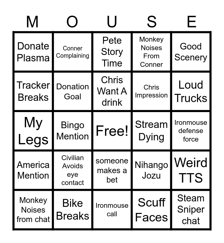 This bingo card has a free space and 27 words: Nihango Jozu, Weirdly sexual comment, Chris Impression, Ironmouse call, Tracker Breaks, Pete Story Time, Conner Complaining, America Mention, Stream Dying, Weird TTS, My Legs, Monkey Noises From Conner, Monkey Noises from chat, Bike Breaks, Loud Trucks, Loudly Enjoy Food, Donation Goal, Chris Want A drink, Civilian Avoids eye contact, Donate Plasma, Ironmouse defense force, Scuff Faces, Bingo Mention, Steam Sniper chat, someone makes a bet, Good Scenery and Ludwig Mention.