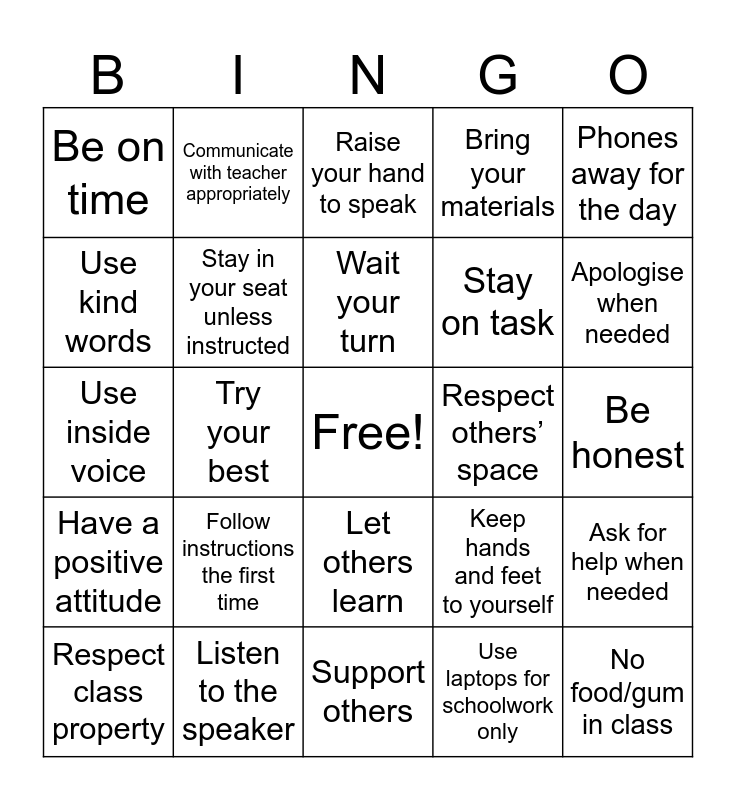 This bingo card has a free space and 24 words: Follow instructions the first time, Listen to the speaker, Wait your turn, Respect class property, Phones away for the day, Be on time, Use kind words, Communicate with teacher appropriately, Respect others’ space, Let others learn, Stay on task, Use inside voice, Keep hands and feet to yourself, Ask for help when needed, Stay in your seat unless instructed, Use laptops for schoolwork only, Be honest, Raise your hand to speak, Apologise when needed, Try your best, No food/gum in class, Have a positive attitude, Bring your materials and Support others.
