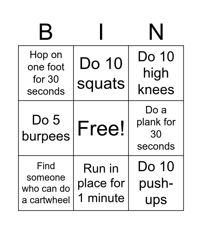 This bingo card has a free space and 11 words: Do 10 jumping jacks, Run in place for 1 minute, Do 10 push-ups, Find someone who can do a cartwheel, Do 10 squats, Do 10 high knees, Do a plank for 30 seconds, Find someone who runs, Do 5 burpees, Hop on one foot for 30 seconds and Find someone who plays basketball.