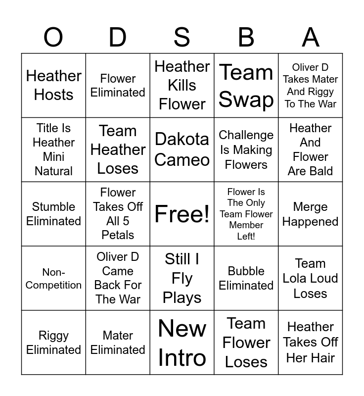 This bingo card has a free space and 24 words: Oliver D Came Back For The War, Mater Eliminated, Dakota Cameo, Riggy Eliminated, Oliver D Takes Mater And Riggy To The War, Heather Hosts, Title Is Heather Mini Natural, Flower Eliminated, Flower Is The Only Team Flower Member Left!, Still I Fly Plays, Challenge Is Making Flowers, Stumble Eliminated, Bubble Eliminated, Team Lola Loud Loses, Team Heather Loses, Team Flower Loses, Merge Happened, Heather Kills Flower, Heather And Flower Are Bald, Flower Takes Off All 5 Petals, Heather Takes Off Her Hair, Non-Competition, Team Swap and New Intro.