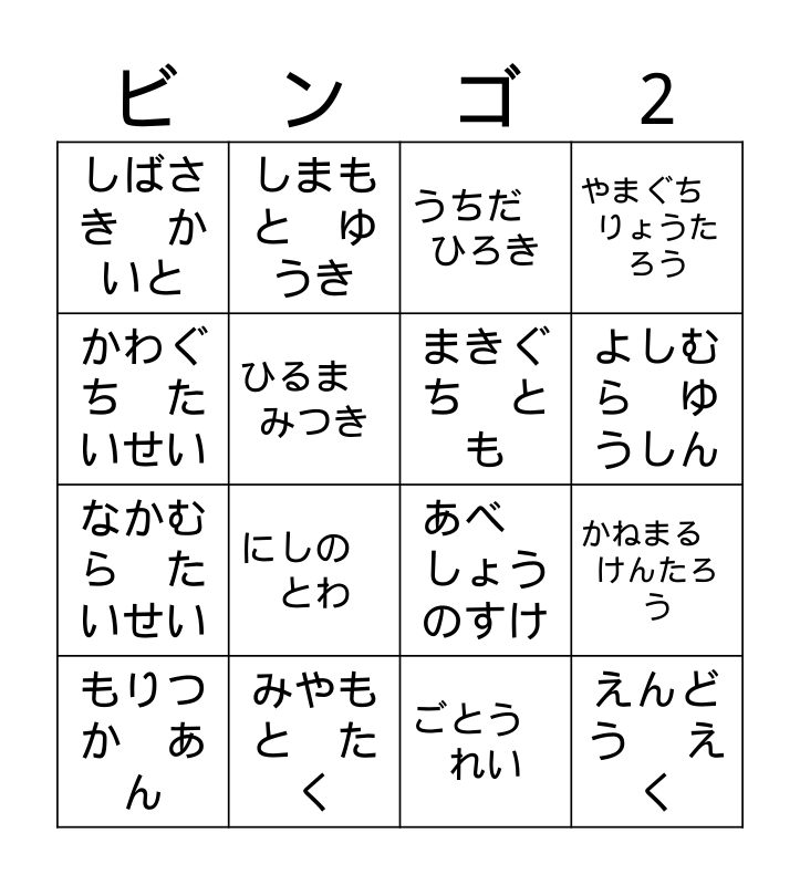 This bingo card has 19 words: あべ しょうのすけ, いけやま ともひさ, うちだ ひろき, えんどう えく, かねまる けんたろう, かわぐち たいせい, ごとう れい, しばさき かいと, しまもと ゆうき, なかむら たいせい, にしの とわ, ひるま みつき, まきぐち とも, みやもと たく, もりつか あん, もりもと かえで, やまぐち りょうたろう, よしむら ゆうしん and わくい こうた.