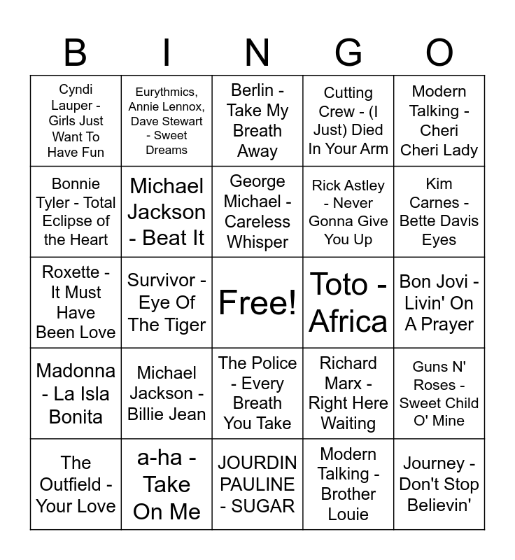 This bingo card has a free space and 24 words: Michael Jackson - Billie Jean, a-ha - Take On Me, George Michael - Careless Whisper, The Outfield - Your Love, Modern Talking - Cheri Cheri Lady, Cyndi Lauper - Girls Just Want To Have Fun, Bonnie Tyler - Total Eclipse of the Heart, Eurythmics, Annie Lennox, Dave Stewart - Sweet Dreams, Toto - Africa, The Police - Every Breath You Take, Rick Astley - Never Gonna Give You Up, Roxette - It Must Have Been Love, Richard Marx - Right Here Waiting, Guns N' Roses - Sweet Child O' Mine, Michael Jackson - Beat It, Modern Talking - Brother Louie, Bon Jovi - Livin' On A Prayer, Berlin - Take My Breath Away, Kim Carnes - Bette Davis Eyes, Survivor - Eye Of The Tiger, Journey - Don't Stop Believin', Madonna - La Isla Bonita, Cutting Crew - (I Just) Died In Your Arm and JOURDIN PAULINE - SUGAR.