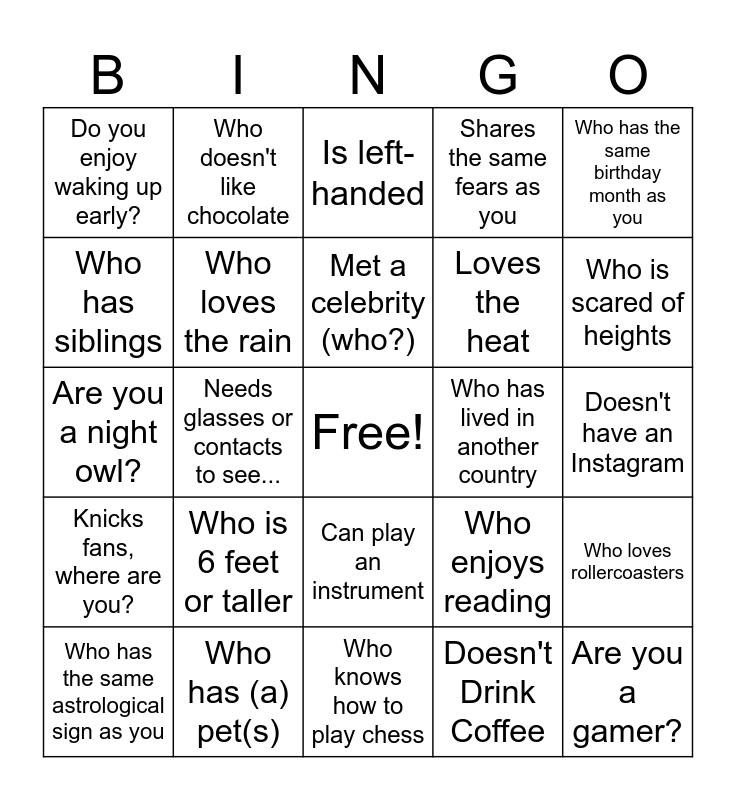 This bingo card has a free space and 29 words: Who has the same astrological sign as you, Team Marvel, where are you?, Needs glasses or contacts to see..., Speaks more than one language, Do you enjoy waking up early?, Is left-handed, Who loves the rain, Who is 6 feet or taller, Who has lived in another country, Who has (a) pet(s), Doesn't have an Instagram, Are you a gamer?, Who knows how to play chess, Doesn't Drink Coffee, Who is scared of heights, Who has the same favorite color as you, Can play an instrument, Knicks fans, where are you?, Who has the same birthday month as you, Are you a night owl?, Who enjoys reading, Are you afraid of spiders?, Loves the heat, Who has siblings, Shares the same fears as you, Who doesn't like chocolate, Who loves rollercoasters, Met a celebrity (who?) and Can swim.