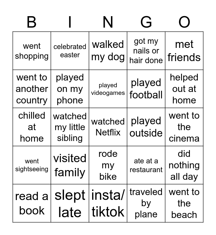 This bingo card has a free space and 24 words: visited family, slept late, played videogames, read a book, met friends, went shopping, went to another country, celebrated easter, played outside, rode my bike, played football, chilled at home, ate at a restaurant, did nothing all day, played on my phone, traveled by plane, went to the cinema, walked my dog, helped out at home, watched my little sibling, went to the beach, went sightseeing, got my nails or hair done and insta/ tiktok.
