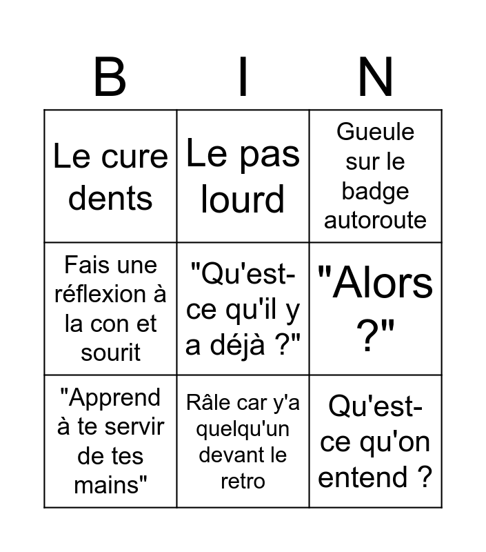 This bingo card has a free space and 8 words: "Alors ?", Gueule sur le badge autoroute, Le pas lourd, "Apprend à te servir de tes mains", Le cure dents, Qu'est-ce qu'on entend ?, Fais une réflexion à la con et sourit and Râle car y'a quelqu'un devant le retro.
