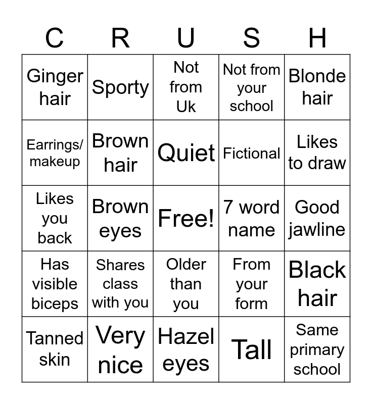 This bingo card has a free space and 32 words: Tall, Average Height, Brown eyes, Blue eyes, Has visible biceps, Brown hair, Blonde hair, Black hair, Sporty, Smart, Quiet, Not from Uk, Goes to gym often, Liked them over a year, 7 word name, Freckles, Tanned skin, Likes you back, Older than you, Shares class with you, From your form, Friends with them, Good jawline, Very nice, Same primary school, Not from your school, Fictional, Earrings/ makeup, Ginger hair, Hazel eyes, Likes gaming and Likes to draw.