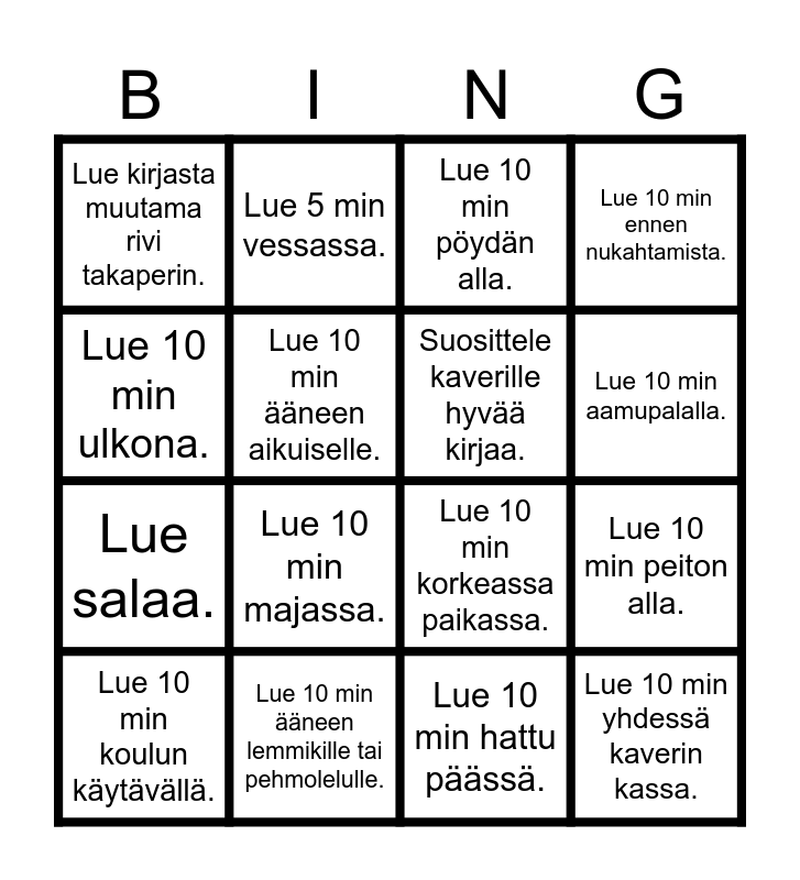 This bingo card has 16 words: Lue 10 min ääneen lemmikille tai pehmolelulle., Lue 10 min peiton alla., Lue 10 min pöydän alla., Lue kirjasta muutama rivi takaperin., Lue salaa., Lue 5 min vessassa., Lue 10 min korkeassa paikassa., Lue 10 min hattu päässä., Lue 10 min ulkona., Lue 10 min ääneen aikuiselle., Lue 10 min koulun käytävällä., Lue 10 min ennen nukahtamista., Lue 10 min majassa., Lue 10 min aamupalalla., Suosittele kaverille hyvää kirjaa. and Lue 10 min yhdessä kaverin kassa..