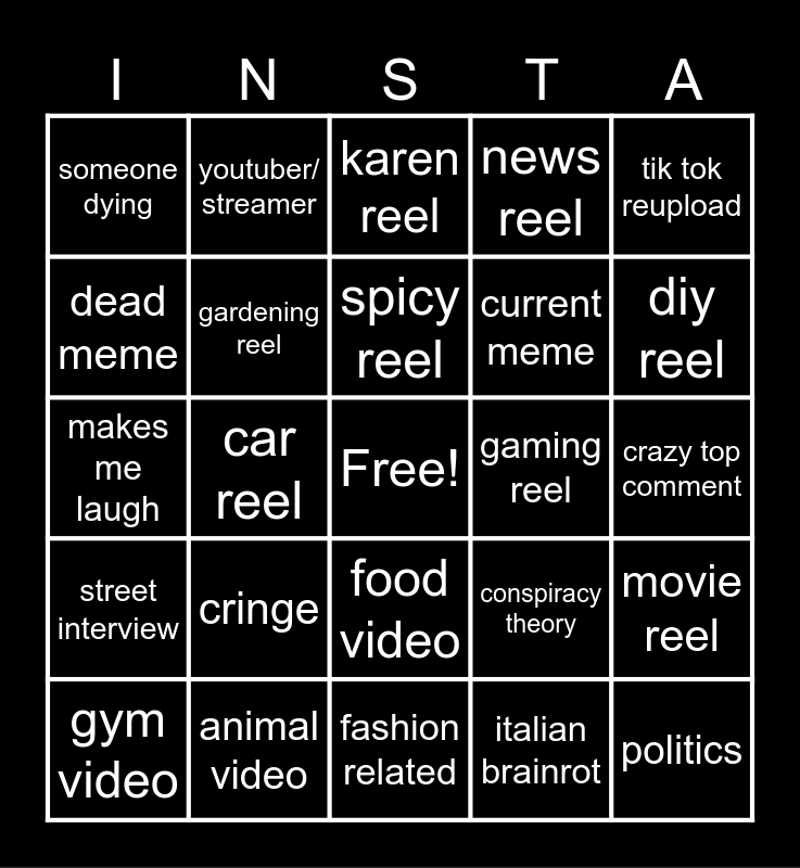 This bingo card has a free space and 24 words: cringe, animal video, spicy reel, gym video, tik tok reupload, someone dying, dead meme, youtuber/ streamer, gaming reel, food video, current meme, makes me laugh, conspiracy theory, movie reel, gardening reel, italian brainrot, crazy top comment, karen reel, diy reel, car reel, politics, street interview, news reel and fashion related.