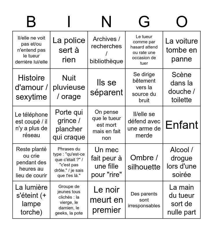 This bingo card has a free space and 24 words: Phrases du type : "qu'est-ce que c'était ?" / "c'est pas drôle." / je sais que t'es là.", Groupe de jeunes tous clichés : la vierge, le damien, le geeks, la pote, Ils se séparent, La lumière s'éteint (+ lampe torche), La voiture tombe en panne, Il/elle ne voit pas et/ou n'entend pas le tueur derrière lui/elle, Histoire d'amour / sexytime, La police sert à rien, Il/elle se défend avec une arme de merde, Un mec fait peur à une fille pour "rire", Se dirige bêtement vers la source du bruit, Le téléphone est coupé / il n'y a plus de réseau, Ombre / silhouette, Alcool / drogue lors d'une soirée, Nuit pluvieuse / orage, Des parents sont irresponsables, Enfant, Archives / recherches / bibliothèque, Scène dans la douche / toilette, Porte qui grince / plancher qui craque, La main du tueur sort de nulle part, Reste planté ou crie pendant des heures au lieu de courir, Le tueur comme par hasard attend ou rate une occasion de tuer and Le noir meurt en premier.