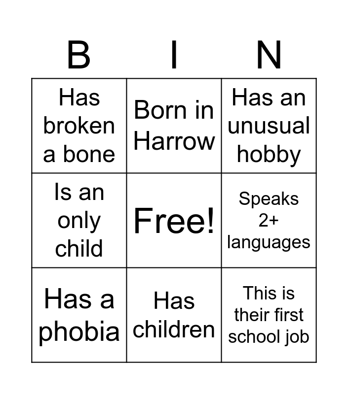 This bingo card has a free space and 8 words: Speaks 2+ languages, Has an unusual hobby, Born in Harrow, Has a phobia, Has broken a bone, This is their first school job, Is an only child and Has children.