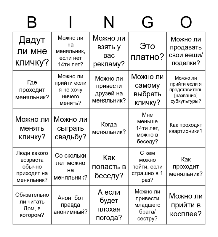This bingo card has a free space and 24 words: Со скольки лет можно на меняльник?, Анон. бот правда анонимный?, Можно ли привести друзей на меняльник?, Обязательно ли читать Дом, в котором?, Можно ли продавать свои вещи/поделки?, Дадут ли мне кличку?, Где проходит меняльник?, Можно ли на меняльник, если нет 14ти лет?, Мне меньше 14ти лет, можно в беседу?, Как попасть в беседу?, Можно ли самому выбрать кличку?, Можно ли менять кличку?, С кем можно пойти, если страшно в 1 раз?, Как проходит меняльник?, Можно ли прийти если я не хочу ничего менять?, Можно ли привести младшего брата/сестру?, Как проходят квартирники?, Можно ли взять у вас рекламу?, Можно ли прийти если я представитель [название] субкультуры?, Можно ли сыграть свадьбу?, Можно ли прийти в косплее?, Люди какого возраста обычно приходят на меняльник?, Это платно? and А если будет плохая погода?.
