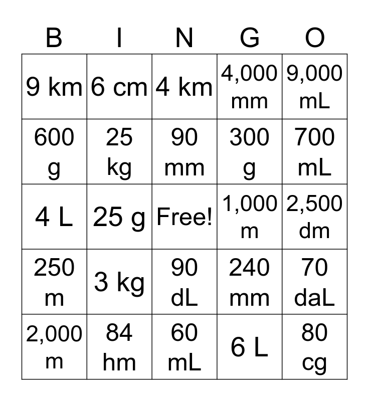 This bingo card has a free space and 24 words: 2,000 m, 3 kg, 90 mm, 6 L, 9,000 mL, 9 km, 6 cm, 4 km, 1,000 m, 2,500 dm, 4 L, 25 kg, 240 mm, 70 daL, 600 g, 84 hm, 60 mL, 4,000 mm, 700 mL, 250 m, 25 g, 90 dL, 300 g and 80 cg.