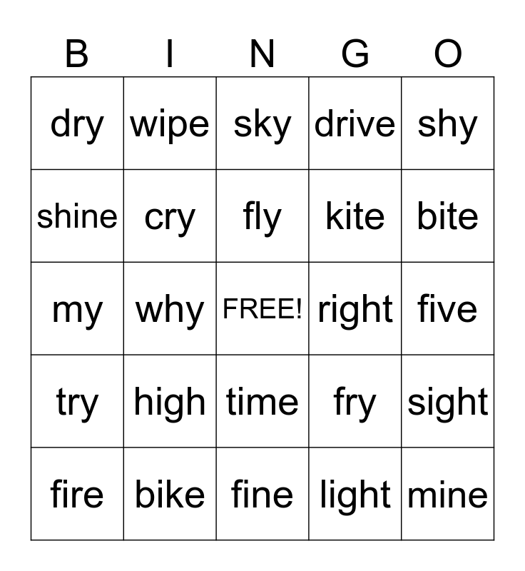 This bingo card has a free space and 24 words: high, bike, fly, fire, shy, dry, shine, wipe, right, time, kite, my, fry, sight, cry, light, five, sky, bite, why, mine, try, drive and fine.