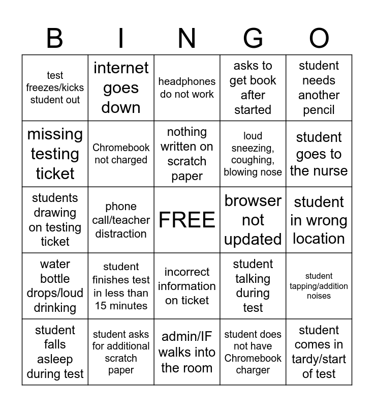 This bingo card has a free space and 24 words: student finishes test in less than 15 minutes, student asks for additional scratch paper, nothing written on scratch paper, student falls asleep during test, student needs another pencil, test freezes/kicks student out, missing testing ticket, internet goes down, browser not updated, incorrect information on ticket, loud sneezing, coughing, blowing nose, students drawing on testing ticket, student talking during test, student tapping/addition noises, Chromebook not charged, student does not have Chromebook charger, student in wrong location, headphones do not work, student goes to the nurse, phone call/teacher distraction, student comes in tardy/start of test, water bottle drops/loud drinking, asks to get book after started and admin/IF walks into the room.