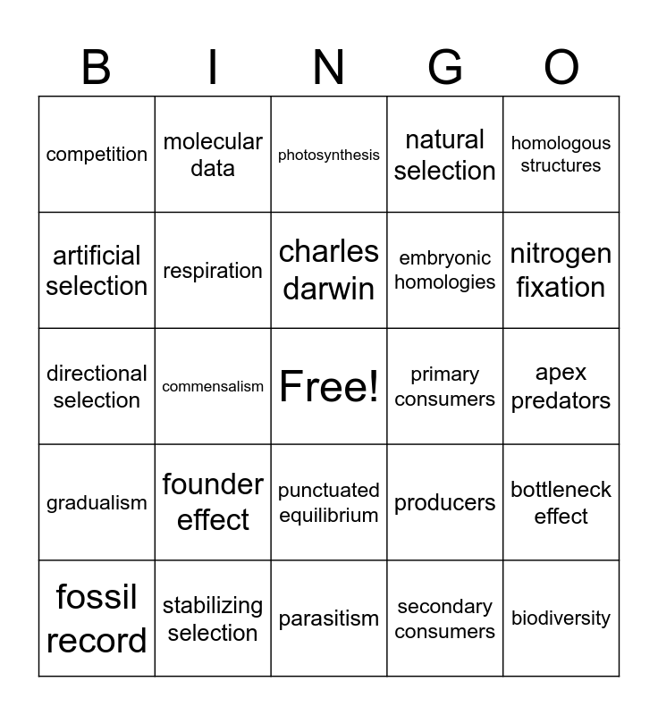 This bingo card has a free space and 31 words: parasitism, predation, commensalism, mutualism, competition, photosynthesis, respiration, producers, primary consumers, secondary consumers, apex predators, biodiversity, sunlight, burning fossil fuels, nitrogen fixation, gene flow, bottleneck effect, founder effect, gradualism, punctuated equilibrium, homologous structures, vestigial structures, fossil record, molecular data, embryonic homologies, artificial selection, natural selection, directional selection, stabilizing selection, charles darwin and gregor mendel.