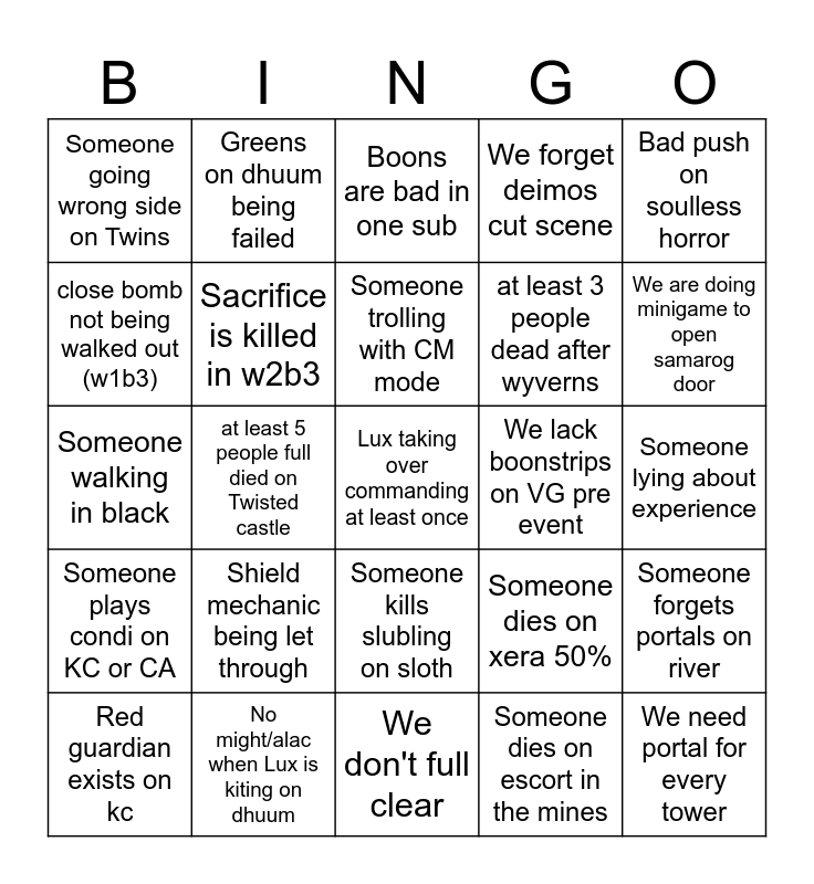 This bingo card has a free space and 24 words: Shield mechanic being let through, No might/alac when Lux is kiting on dhuum, Someone trolling with CM mode, Red guardian exists on kc, Bad push on soulless horror, Someone going wrong side on Twins, close bomb not being walked out (w1b3), Greens on dhuum being failed, We lack boonstrips on VG pre event, Someone kills slubling on sloth, at least 3 people dead after wyverns, Someone walking in black, Someone dies on xera 50%, Someone forgets portals on river, Sacrifice is killed in w2b3, Someone dies on escort in the mines, Someone lying about experience, Boons are bad in one sub, We are doing minigame to open samarog door, at least 5 people full died on Twisted castle, We need portal for every tower, Someone plays condi on KC or CA, We forget deimos cut scene and We don't full clear.