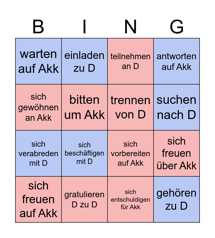 This bingo card has 16 words: gratulieren D zu D, sich freuen über Akk, teilnehmen an D, warten auf Akk, sich verabreden mit D, einladen zu D, sich vorbereiten auf Akk, sich entschuldigen für Akk, sich gewöhnen an Akk, bitten um Akk, sich freuen auf Akk, antworten auf Akk, sich beschäftigen mit D, suchen nach D, trennen von D and gehören zu D.