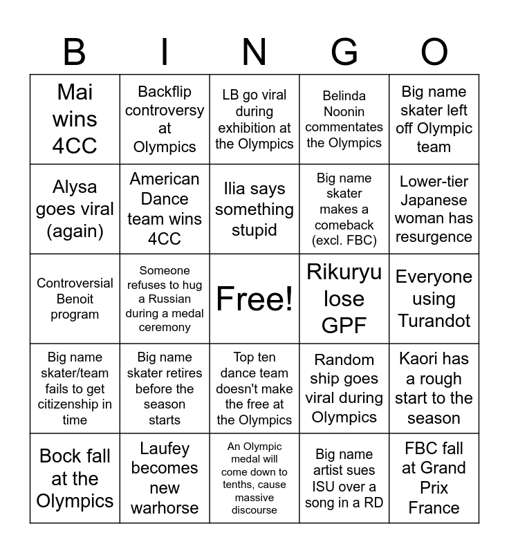 This bingo card has a free space and 24 words: Big name skater retires before the season starts, Laufey becomes new warhorse, Ilia says something stupid, Bock fall at the Olympics, Big name skater left off Olympic team, Mai wins 4CC, Alysa goes viral (again), Backflip controversy at Olympics, Rikuryu lose GPF, Top ten dance team doesn't make the free at the Olympics, Big name skater makes a comeback (excl. FBC), Controversial Benoit program, Random ship goes viral during Olympics, Kaori has a rough start to the season, American Dance team wins 4CC, Big name artist sues ISU over a song in a RD, Everyone using Turandot, LB go viral during exhibition at the Olympics, Lower-tier Japanese woman has resurgence, Someone refuses to hug a Russian during a medal ceremony, FBC fall at Grand Prix France, Big name skater/team fails to get citizenship in time, Belinda Noonin commentates the Olympics and An Olympic medal will come down to tenths, cause massive discourse.