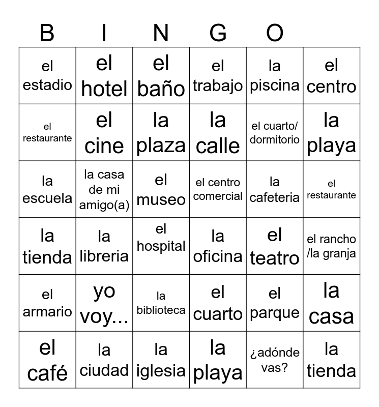 This bingo card has 36 words: el cuarto, la biblioteca, la playa, el restaurante, la tienda, el centro comercial, el cine, la iglesia, la piscina, el parque, la playa, el trabajo, la casa, la casa de mi amigo(a), la calle, el estadio, el armario, la cafeteria, la escuela, el baño, el museo, la libreria, la oficina, el hospital, el teatro, el hotel, el cuarto/ dormitorio, la ciudad, la plaza, el centro, la tienda, el café, el rancho /la granja, el restaurante, yo voy... and ¿adónde vas?.
