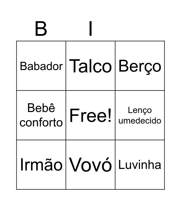 This bingo card has a free space and 24 words: Chupeta, Mamadeira, Fralda, Cueiro, Chocalho, Berço, Babador, Talco, Trocador, Body, Carrinho, Pomada, Escova, Naninha, Luvinha, Banheira, Leite, Lenço umedecido, Bebê conforto, Mamãe, Papai, Irmão, Vovó and Vovô.