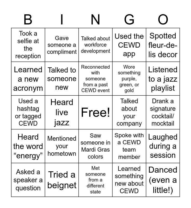 This bingo card has a free space and 30 words: Tried a beignet, Ate something new, Heard live jazz, Snagged a CEWD swag item, Took a selfie at the reception, Talked about workforce development, Talked to someone new, Saw someone in Mardi Gras colors, Talked about your company, Met someone from a different state, Drank a signature cocktail/ mocktail, Danced (even a little!), Learned something new about CEWD, Shared a fun fact you learned, Listened to a jazz playlist, Took a photo with beads, Spoke with a CEWD team member, Heard the word “energy”, Mentioned your hometown, Spotted fleur-de-lis decor, Used a hashtag or tagged CEWD, Asked someone what they do, Gave someone a compliment, Wore something purple, green, or gold, Learned a new acronym, Used the CEWD app, Laughed during a session, Asked a speaker a question, Reconnected with someone from a past CEWD event and Took a photo of the food.