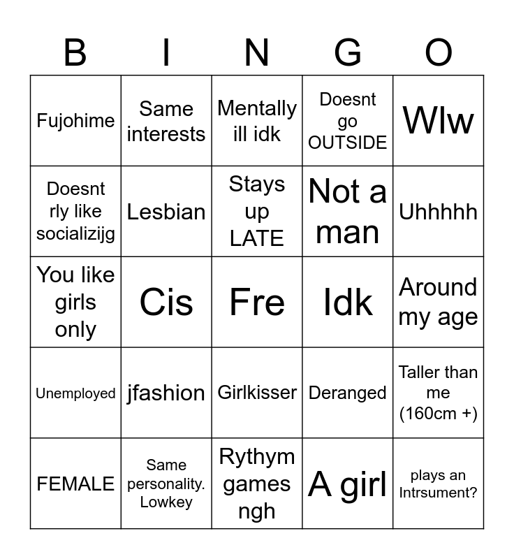 This bingo card has a free space and 24 words: jfashion, Same personality. Lowkey, Stays up LATE, FEMALE, Wlw, Fujohime, Doesnt rly like socializijg, Same interests, Idk, Girlkisser, Not a man, You like girls only, Deranged, Taller than me (160cm +), Lesbian, A girl, Around my age, Mentally ill idk, Uhhhhh, Cis, plays an Intrsument?, Unemployed, Doesnt go OUTSIDE and Rythym games ngh.