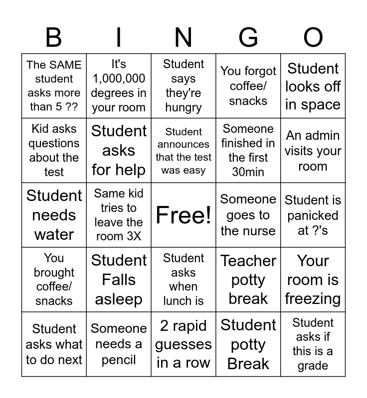 This bingo card has a free space and 24 words: Student Falls asleep, Someone needs a pencil, Student announces that the test was easy, Student asks what to do next, Student looks off in space, The SAME student asks more than 5 ??, Kid asks questions about the test, It's 1,000,000 degrees in your room, Someone goes to the nurse, Student asks when lunch is, Someone finished in the first 30min, Student needs water, Teacher potty break, Your room is freezing, Student asks for help, Student potty Break, Student is panicked at ?'s, Student says they're hungry, An admin visits your room, Same kid tries to leave the room 3X, Student asks if this is a grade, You brought coffee/ snacks, You forgot coffee/ snacks and 2 rapid guesses in a row.