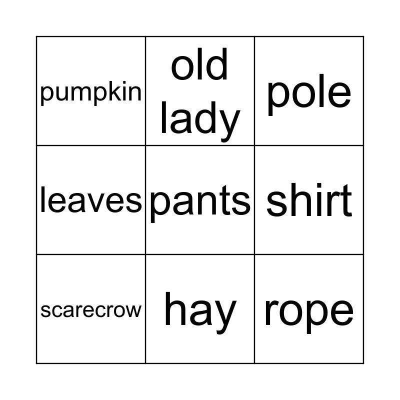 This bingo card has 9 words: scarecrow, pole, old lady, leaves, pumpkin, shirt, pants, rope and hay.