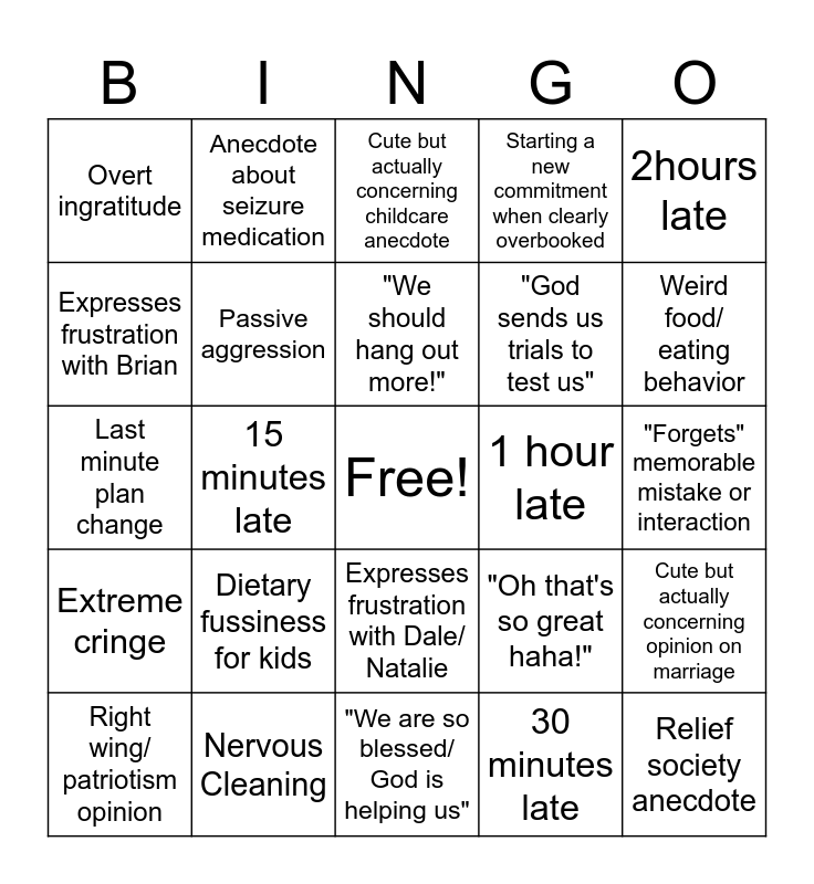 This bingo card has a free space and 24 words: Dietary fussiness for kids, Nervous Cleaning, "We should hang out more!", Right wing/ patriotism opinion, 2hours late, Overt ingratitude, Expresses frustration with Brian, Anecdote about seizure medication, 1 hour late, Expresses frustration with Dale/ Natalie, "God sends us trials to test us", Last minute plan change, "Oh that's so great haha!", Cute but actually concerning opinion on marriage, Passive aggression, 30 minutes late, "Forgets" memorable mistake or interaction, Cute but actually concerning childcare anecdote, Weird food/ eating behavior, 15 minutes late, Relief society anecdote, Extreme cringe, Starting a new commitment when clearly overbooked and "We are so blessed/ God is helping us".