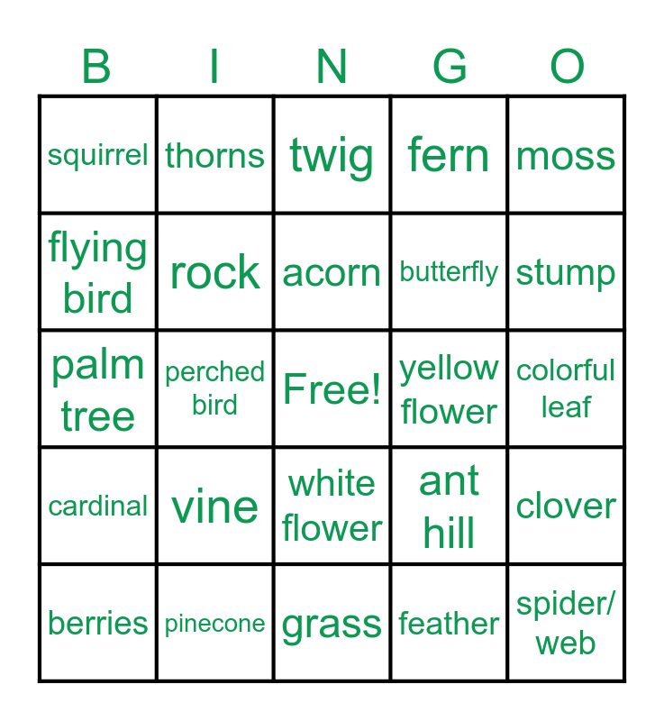 This bingo card has a free space and 24 words: vine, pinecone, acorn, berries, moss, squirrel, flying bird, thorns, yellow flower, white flower, butterfly, palm tree, ant hill, clover, rock, feather, colorful leaf, twig, stump, perched bird, spider/ web, cardinal, fern and grass.