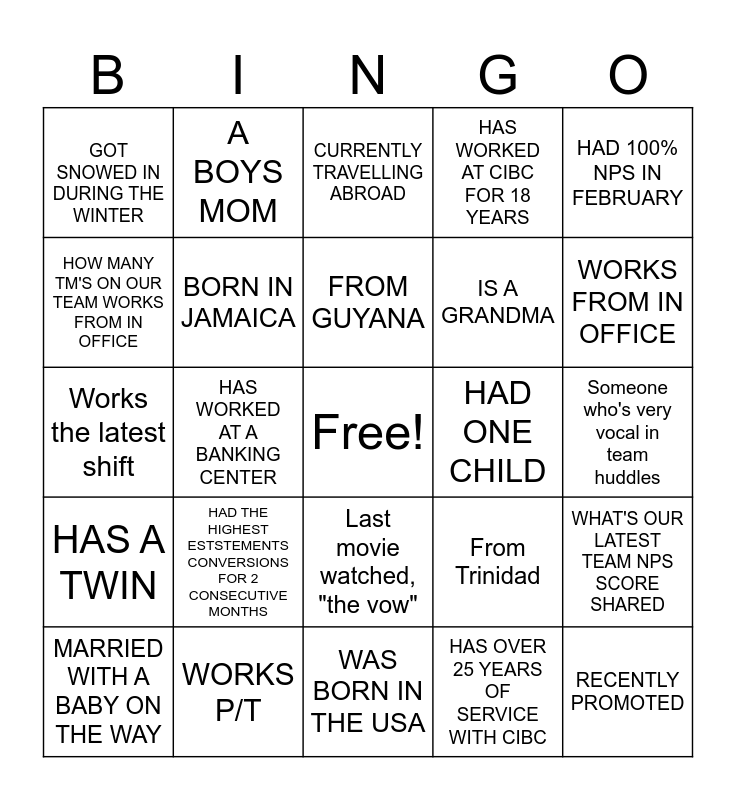 This bingo card has a free space and 24 words: HAD THE HIGHEST ESTSTEMENTS CONVERSIONS FOR 2 CONSECUTIVE MONTHS, WORKS P/T, FROM GUYANA, MARRIED WITH A BABY ON THE WAY, HAD 100% NPS IN FEBRUARY, GOT SNOWED IN DURING THE WINTER, HOW MANY TM'S ON OUR TEAM WORKS FROM IN OFFICE, A BOYS MOM, HAD ONE CHILD, Last movie watched, "the vow", IS A GRANDMA, Works the latest shift, From Trinidad, WHAT'S OUR LATEST TEAM NPS SCORE SHARED, BORN IN JAMAICA, HAS OVER 25 YEARS OF SERVICE WITH CIBC, Someone who's very vocal in team huddles, CURRENTLY TRAVELLING ABROAD, WORKS FROM IN OFFICE, HAS WORKED AT A BANKING CENTER, RECENTLY PROMOTED, HAS A TWIN, HAS WORKED AT CIBC FOR 18 YEARS and WAS BORN IN THE USA.