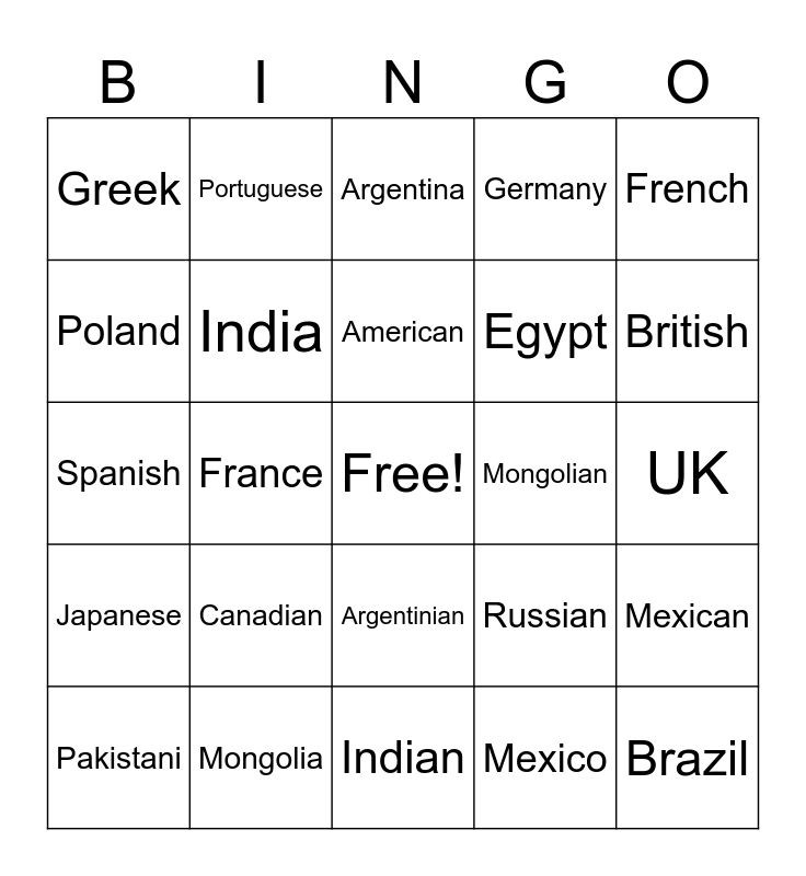 This bingo card has a free space and 42 words: US, American, Canada, Canadian, Mexico, Mexican, Brazil, Brazilian, Argentina, Argentinian, UK, British, France, French, Russia, Russian, Spain, Spanish, Portugal, Portuguese, Poland, Polish, Greece, Greek, Turkey, Turkish, Egypt, Egyptian, China, Chinese, Japan, Japanese, India, Indian, Pakistan, Pakistani, Mongolia, Mongolian, Australia, Australian, Germany and German.
