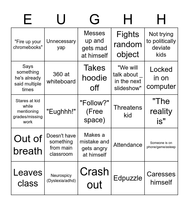 This bingo card has a free space and 34 words: CER, Edpuzzle, Making Assignment, Gatekeeping, Out of breath, 360 at whiteboard, Not trying to politically deviate kids, Leaves class, Unnecessary yap, Peardeck, Takes hoodie off, Messes up and gets mad at himself, Glazes himself, Off topic, Threatens kid, Locked in on computer, Neurospicy (Dyslexia/adhd), Stares at kid while mentioning grades/missing work, Doesn't have something from main classroom, Attendance, Makes a mistake and gets angry at himself, “This is an appropriate time to listen to music now”, "Fire up your chromebooks", "The reality is", Crash out, Caresses himself, Fights random object, "Have we already talked about _", "We will talk about _ in the next slideshow", Says something he's already said multiple times, Sports, "Eughhh!", Someone is on phone/game/asleep and Genuine pure primal rage.