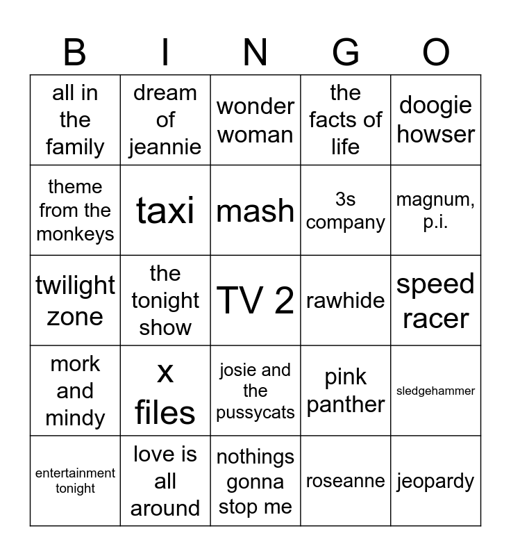This bingo card has a free space and 60 words: the greatist american hero, love is all around, welcome back, kotter, mork and mindy, roseanne, wkrp in cincinnati, taxi, barney miller, 3s company, benson, the facts of life, good times, theme from the monkeys, car 54, where are you, and then theres maude, all in the family, jeopardy, doogie howser, st. elsewhere, mash, rawhide, wonder woman, entertainment tonight, sledgehammer, law and order, tales from the crypt, the A team, quantum leap, magnum, p.i., monty pythons flying circus, sesame street, the muppet show, the simpsons, bugs bunny, dream of jeannie, lone ranger, secret agent man, the tonight show, dog pound hop, twilight zone, lost in space, x files, speed racer, inspector gadget, pink panther, the smurfs, together (silverspoons), scooby doo, carmen san diego, josie and the pussycats, nothings gonna stop me, you can count on me, h.r. pufnstuf, looney tunes, land of the lost, linus and lucy, cheers, mr. rodgers, the banana splits and thank you for being a friend.