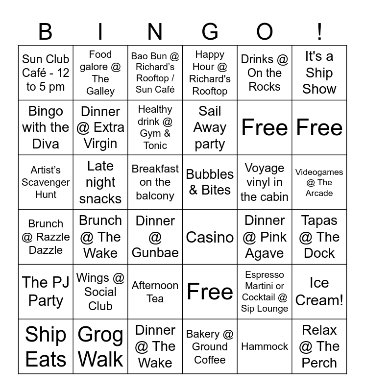 This bingo card has 36 words: Free, Afternoon Tea, Bakery @ Ground Coffee, Bingo with the Diva, Brunch @ Razzle Dazzle, Bubbles & Bites, Dinner @ Extra Virgin, Dinner @ The Wake, Drinks @ On the Rocks, Espresso Martini or Cocktail @ Sip Lounge, Free, Happy Hour @ Richard's Rooftop, Ice Cream!, Late night snacks, Sail Away party, Sun Club Café - 12 to 5 pm, The PJ Party, Voyage vinyl in the cabin, Artist’s Scavenger Hunt, Bao Bun @ Richard’s Rooftop / Sun Café, Breakfast on the balcony, Brunch @ The Wake, Casino, Dinner @ Gunbae, Dinner @ Pink Agave, Food galore @ The Galley, Free, Grog Walk, Healthy drink @ Gym & Tonic, It's a Ship Show, Relax @ The Perch, Ship Eats, Tapas @ The Dock, Videogames @ The Arcade, Wings @ Social Club and Hammock.