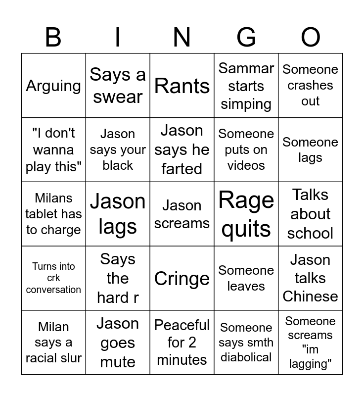 This bingo card has a free space and 24 words: Says the hard r, Jason goes mute, Jason says he farted, Milan says a racial slur, Someone crashes out, Arguing, "I don't wanna play this", Says a swear, Rage quits, Cringe, Someone puts on videos, Milans tablet has to charge, Someone leaves, Jason talks Chinese, Jason says your black, Someone says smth diabolical, Talks about school, Rants, Someone lags, Jason lags, Someone screams "im lagging", Turns into crk conversation, Sammar starts simping and Peaceful for 2 minutes.
