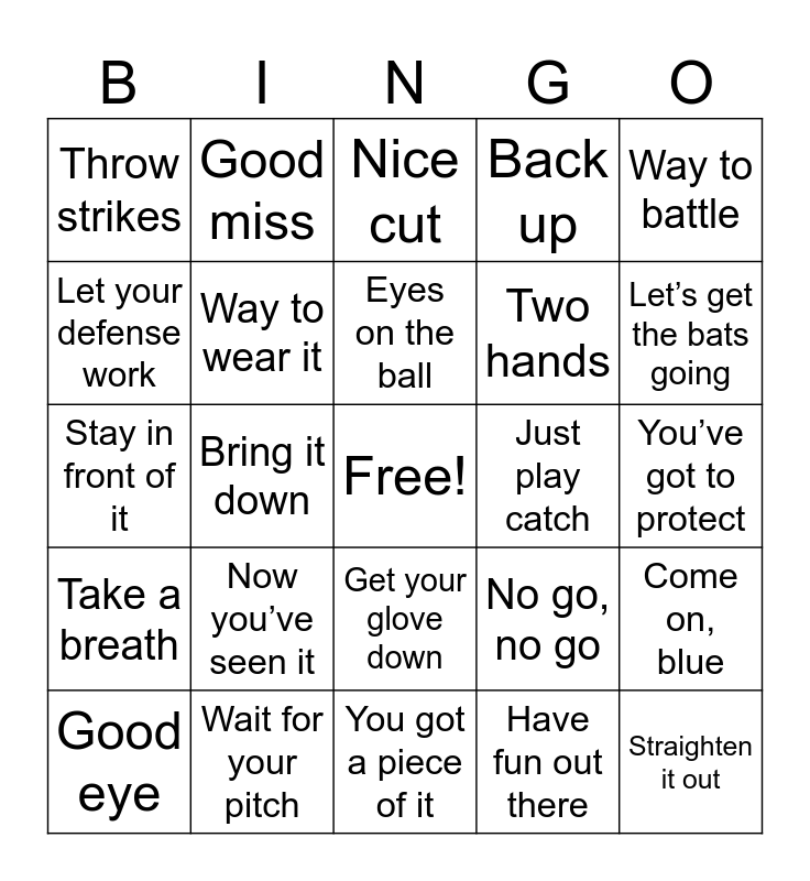 This bingo card has a free space and 24 words: Now you’ve seen it, Wait for your pitch, Eyes on the ball, Good eye, Way to battle, Throw strikes, Let your defense work, Good miss, Just play catch, Get your glove down, Two hands, Stay in front of it, No go, no go, Come on, blue, Way to wear it, Have fun out there, You’ve got to protect, Nice cut, Let’s get the bats going, Bring it down, Straighten it out, Take a breath, Back up and You got a piece of it.