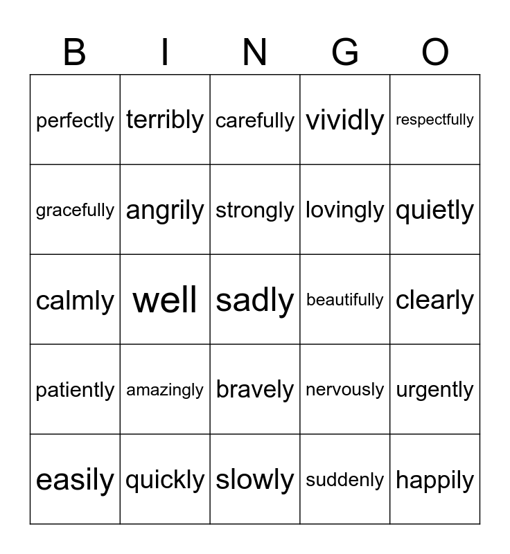 This bingo card has a free space and 29 words: easily, cheaply, well, badly, perfectly, carefully, angrily, amazingly, beautifully, quickly, clearly, happily, slowly, suddenly, quietly, loudly, bravely, patiently, respectfully, calmly, nervously, curiously, lovingly, gracefully, vividly, terribly, urgently, strongly and weakly.