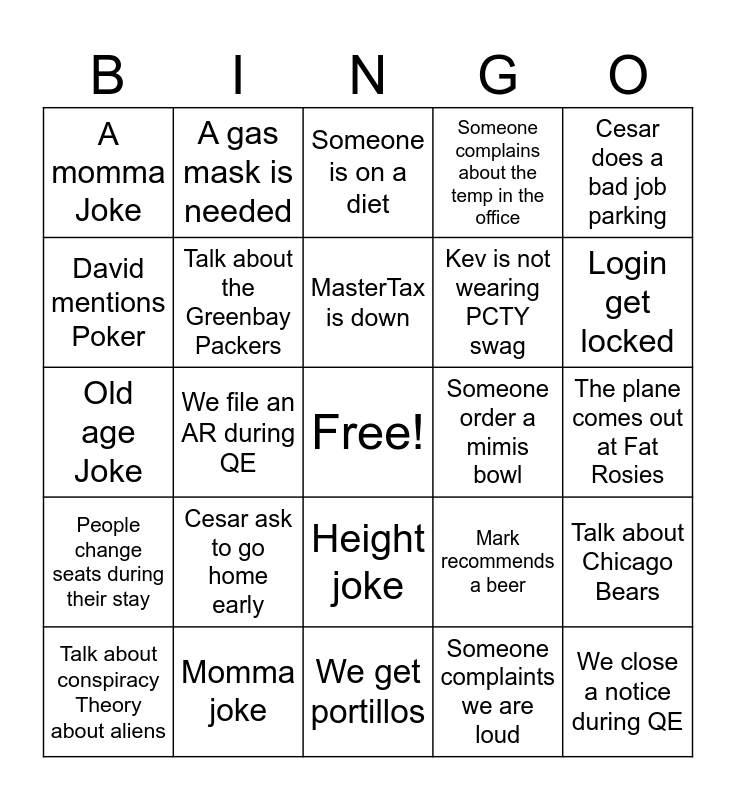 This bingo card has a free space and 24 words: Cesar ask to go home early, Momma joke, MasterTax is down, Talk about conspiracy Theory about aliens, Cesar does a bad job parking, A momma Joke, David mentions Poker, A gas mask is needed, Someone order a mimis bowl, Height joke, Kev is not wearing PCTY swag, Old age Joke, Mark recommends a beer, Talk about Chicago Bears, Talk about the Greenbay Packers, Someone complaints we are loud, The plane comes out at Fat Rosies, Someone is on a diet, Login get locked, We file an AR during QE, We close a notice during QE, People change seats during their stay, Someone complains about the temp in the office and We get portillos.