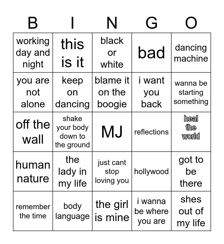 This bingo card has a free space and 52 words: scream, shes out of my life, smooth criminal, the girl is mine, the lady in my life, the way you make me feel, this is it, thriller, you are not alone, say say say, keep on dancing, baby be mine, got to be there, hollywood, maria, never can say goodbye, blame it on the boogie, reflections, can you feel it, dancing machine, shake your body down to the ground, i wanna be where you are, working day and night, i want you back, enjoy yourself, candy girl, dangerous, leave me alone, wanna be starting something, abc, another part of me, bad, beat it, ben, billie jean, black or white, body language, dirt diana, dont stop till you get enough, get on the floor, ghost, heal the world, human nature, i cant help it, just cant stop loving you, ill be there, man in the mirror, off the wall, one more chance, p y t, remember the time and rock with you.