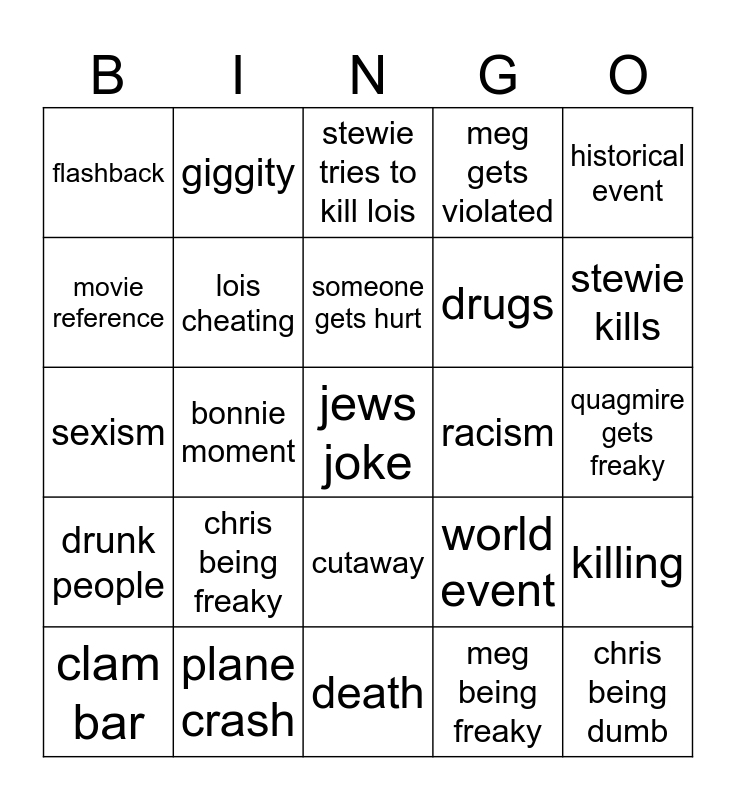 This bingo card has a free space and 24 words: chris being freaky, plane crash, someone gets hurt, clam bar, historical event, flashback, movie reference, giggity, racism, cutaway, drugs, sexism, world event, killing, lois cheating, meg being freaky, quagmire gets freaky, stewie tries to kill lois, stewie kills, bonnie moment, chris being dumb, drunk people, meg gets violated and death.