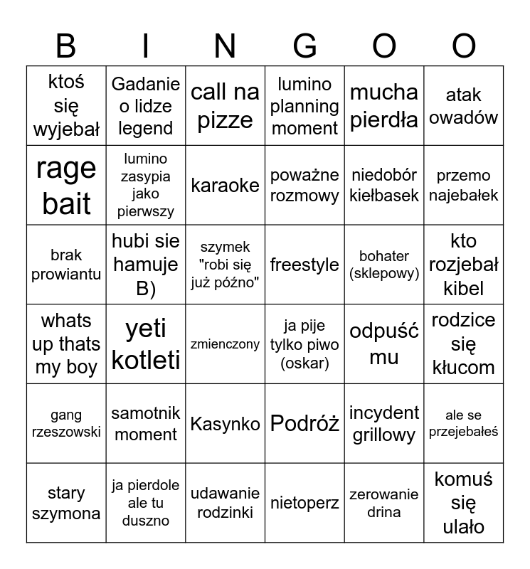 This bingo card has 36 words: Podróż, Kasynko, nietoperz, rage bait, whats up thats my boy, freestyle, lumino zasypia jako pierwszy, udawanie rodzinki, mucha pierdła, incydent grillowy, przemo najebałek, lumino planning moment, ale se przejebałeś, hubi sie hamuje B), poważne rozmowy, ktoś się wyjebał, gang rzeszowski, bohater (sklepowy), brak prowiantu, call na pizze, szymek "robi się już późno", yeti kotleti, ja pije tylko piwo (oskar), zmienczony, odpuść mu, Gadanie o lidze legend, niedobór kiełbasek, ja pierdole ale tu duszno, karaoke, atak owadów, komuś się ulało, stary szymona, rodzice się kłucom, kto rozjebał kibel, samotnik moment and zerowanie drina.