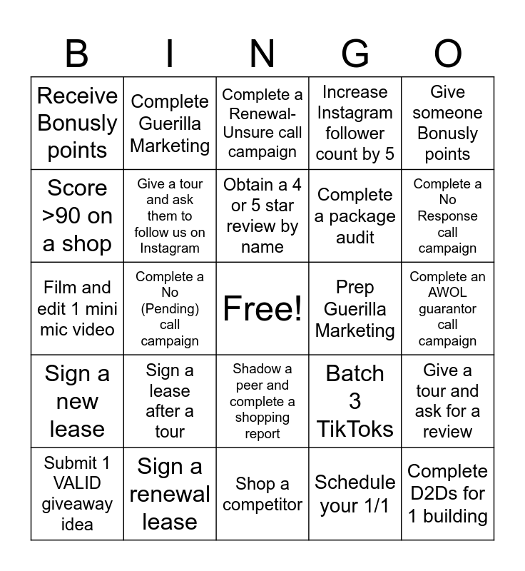 This bingo card has a free space and 25 words: Sign a lease after a tour, Shop a competitor, Obtain a 4 or 5 star review by name, Submit 1 VALID giveaway idea, Give someone Bonusly points, Receive Bonusly points, Score >90 on a shop, Complete Guerilla Marketing, Prep Guerilla Marketing, Shadow a peer and complete a shopping report, Complete a package audit, Film and edit 1 mini mic video, Batch 3 TikToks, Give a tour and ask for a review, Give a tour and ask them to follow us on Instagram, Complete an AWOL call campaign, Complete an AWOL guarantor call campaign, Complete a Renewal-Unsure call campaign, Complete a No Response call campaign, Complete a No (Pending) call campaign, Complete D2Ds for 1 building, Sign a renewal lease, Sign a new lease, Increase Instagram follower count by 5 and Schedule your 1/1.