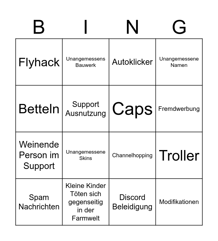 This bingo card has 16 words: Kleine Kinder Töten sich gegenseitig in der Farmwelt, Troller, Autoklicker, Flyhack, Weinende Person im Support, Unangemessens Bauwerk, Channelhopping, Discord Beleidigung, Betteln, Support Ausnutzung, Spam Nachrichten, Unangemessene Namen, Unangemessene Skins, Fremdwerbung, Caps and Modifikationen.