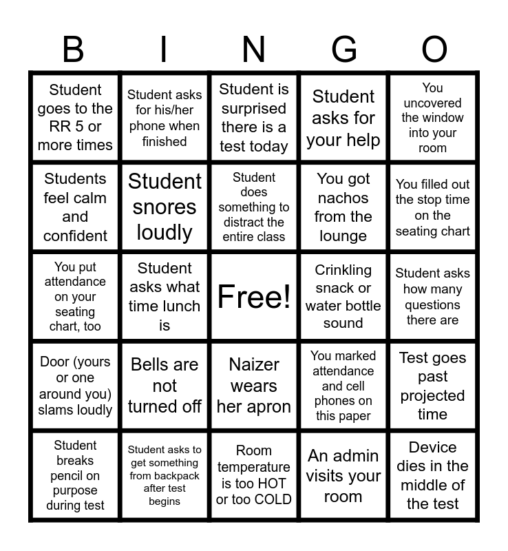 This bingo card has a free space and 29 words: Student breaks pencil on purpose during test, Student sneezes ...does NOT ask for a tissue, Student asks what time lunch is, Student falls asleep within 10 min of starting the test, Student goes to the RR 5 or more times, Student is surprised there is a test today, Student snores loudly, Bells are not turned off, Crinkling snack or water bottle sound, Student asks to get something from backpack after test begins, Student asks how many questions there are, Device dies in the middle of the test, Room temperature is too HOT or too COLD, An admin visits your room, You filled out the stop time on the seating chart, Student complains about sack lunch, Naizer wears her apron, Door (yours or one around you) slams loudly, You uncovered the window into your room, You put attendance on your seating chart, too, You marked attendance and cell phones on this paper, On your break, you went to room 131 for a pick me up snack, You got nachos from the lounge, Students feel calm and confident, Student asks for your help, Student asks for his/her phone when finished, Test goes past projected time, Student does something to distract the entire class and All of your testers are present.