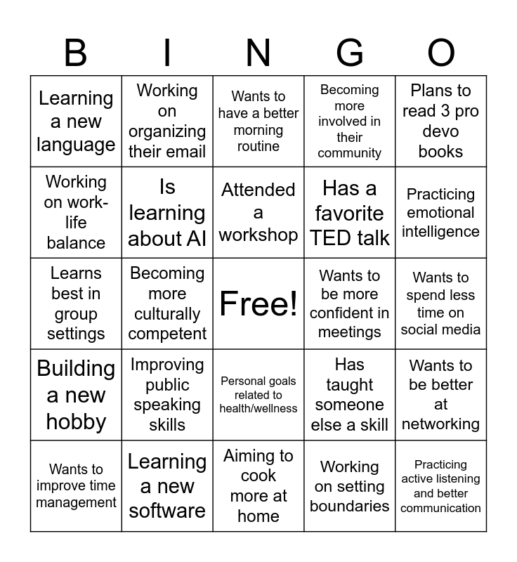This bingo card has a free space and 24 words: Improving public speaking skills, Learning a new software, Attended a workshop, Wants to improve time management, Plans to read 3 pro devo books, Learning a new language, Working on work-life balance, Working on organizing their email, Wants to be more confident in meetings, Personal goals related to health/wellness, Has a favorite TED talk, Learns best in group settings, Has taught someone else a skill, Wants to be better at networking, Is learning about AI, Working on setting boundaries, Wants to spend less time on social media, Wants to have a better morning routine, Practicing emotional intelligence, Becoming more culturally competent, Practicing active listening and better communication, Building a new hobby, Becoming more involved in their community and Aiming to cook more at home.
