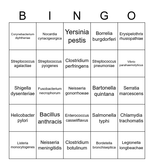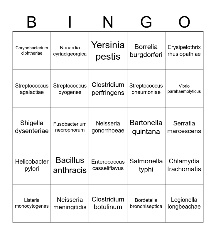 This bingo card has 25 words: Bacillus anthracis, Clostridium botulinum, Clostridium perfringens, Listeria monocytogenes, Erysipelothrix rhusiopathiae, Corynebacterium diphtheriae, Streptococcus agalactiae, Nocardia cyriacigeorgica, Bartonella quintana, Enterococcus casseliflavus, Streptococcus pneumoniae, Shigella dysenteriae, Salmonella typhi, Chlamydia trachomatis, Streptococcus pyogenes, Legionella longbeachae, Serratia marcescens, Yersinia pestis, Vibrio parahaemolyticus, Fusobacterium necrophorum, Neisseria gonorrhoeae, Neisseria meningitidis, Helicobacter pylori, Borrelia burgdorferi and Bordetella bronchiseptica.
