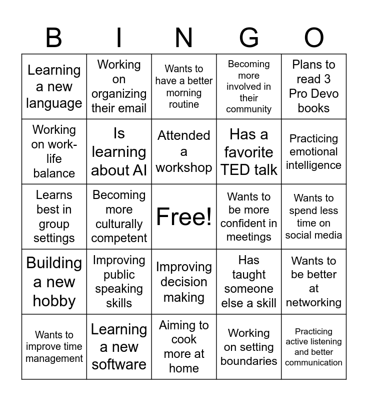 This bingo card has a free space and 24 words: Improving public speaking skills, Learning a new software, Attended a workshop, Wants to improve time management, Plans to read 3 Pro Devo books, Learning a new language, Working on work-life balance, Working on organizing their email, Wants to be more confident in meetings, Improving decision making, Has a favorite TED talk, Learns best in group settings, Has taught someone else a skill, Wants to be better at networking, Is learning about AI, Working on setting boundaries, Wants to spend less time on social media, Wants to have a better morning routine, Practicing emotional intelligence, Becoming more culturally competent, Practicing active listening and better communication, Building a new hobby, Becoming more involved in their community and Aiming to cook more at home.
