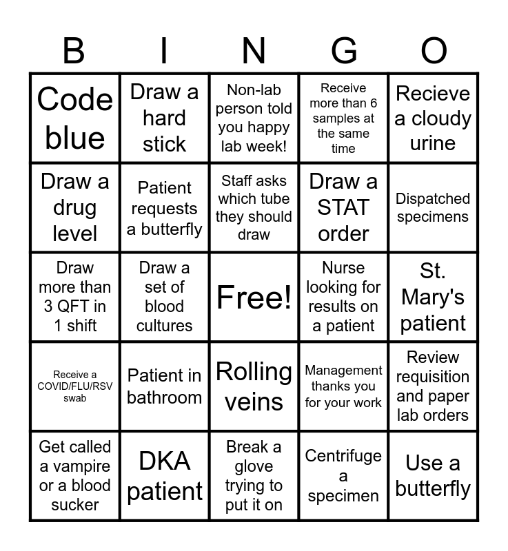 This bingo card has a free space and 68 words: Draw an SCU patient, Draw a set of blood cultures, Draw more than 5 patients with a straight needle, Receive 4 samples from the same patient, Use a butterfly, Draw a PT/PTT, Draw a hard stick, Have no misses all day, Draw a STAT order, Draw a blood bank sample, Receive a COVID/FLU/RSV swab, Answer the phone, Break a glove trying to put it on, Receive more than 6 samples at the same time, No redraws on your patients for one day, Draw a drug level, Patient requests a butterfly, Non-lab person told you happy lab week!, Order a requisition, St. Mary's patient, Draw more than 3 QFT in 1 shift, Patient in bathroom, Rolling veins, Redraw, Tube station down, ED messages for help, Participate in a lab week activity, Draw a pre-op patient, Centrifuge a specimen, Trauma code, Code blue, Rapid response, Code stroke, Answer the front desk, Recieve a cloudy urine, Ask a tech for help releasing orders, Quest only orders, Patient won't hold still, Nurse looking for results on a patient, Dispatched specimens, Get called a vampire or a blood sucker, Have all morning patients me easy sticks, Staff asks which tube they should draw, Add-on labs, Cancer center patient, Front desk doorbell rings, Review all front desk paperwork, Attend huddle, Management thanks you for your work, Review requisition and paper lab orders, Draw a PKU, Call a doctor about orders, The tourniquet is too tight, Patient faints, Draw repeat troponin, Repeat lactate, DKA patient, Draw the same patient more than 3 times in one shift, Draw the same patient multiple days in a row, Defer a draw, Put away supplies, Patient is uncooperative or refuses multiple times, More than 2 legal blood drawn in 1 shift, Draw a legal blood draw, QNS, Received a leaky urine, Type and screen and Patient tells you to use a butterfly when they have a good vein.